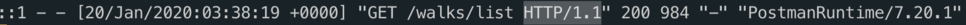 했을때 postman으로 /walks/list에 GET요청을 했을 때 찍히는 로그 입니다.