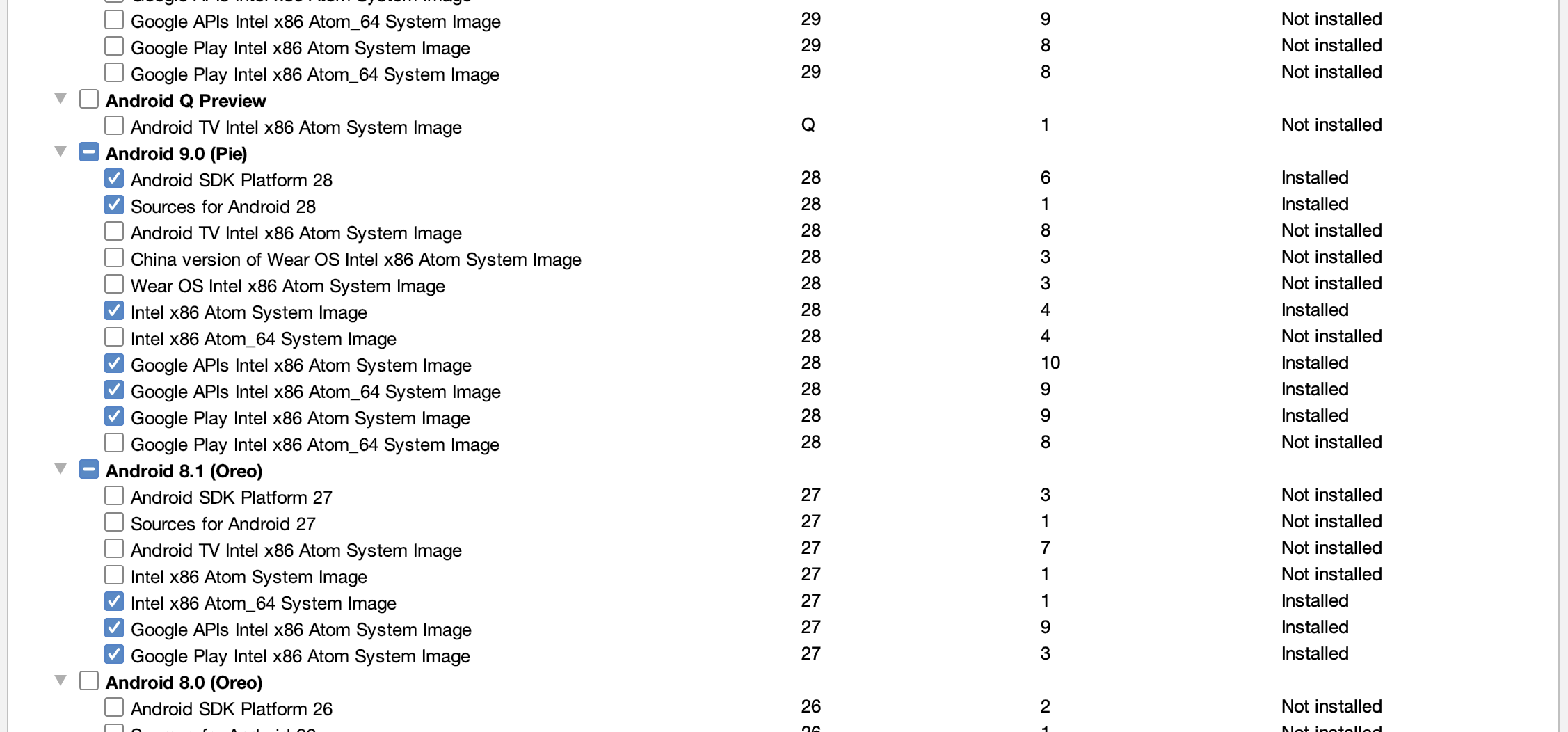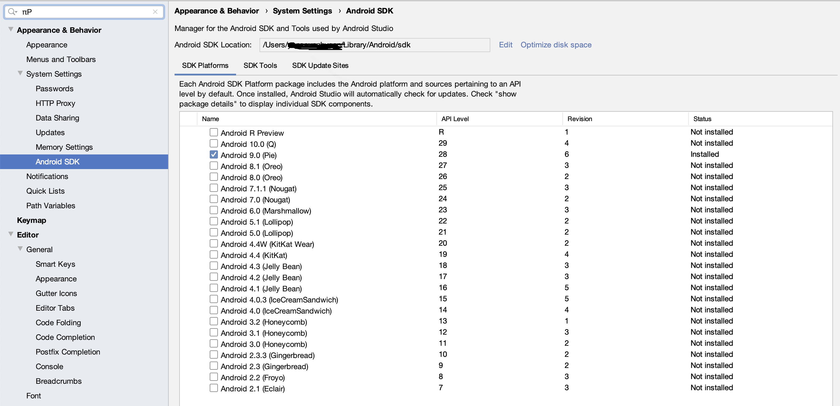 설치 할 수 있는 SDK Platform 여러 버전 중에 저는 9.0버전을 선택하였습니다.그리고 나중에 사용할 예정인 위에 "Android SDK Location" 경로를 복사해 둡니다.